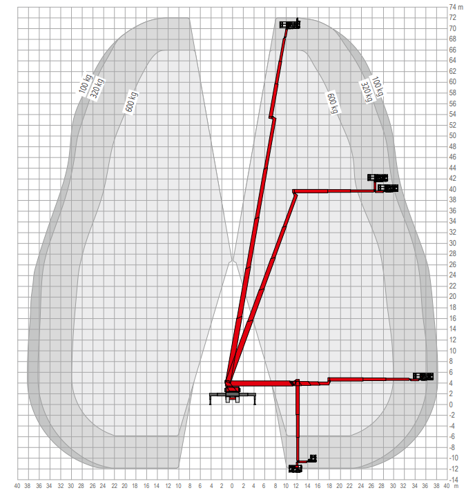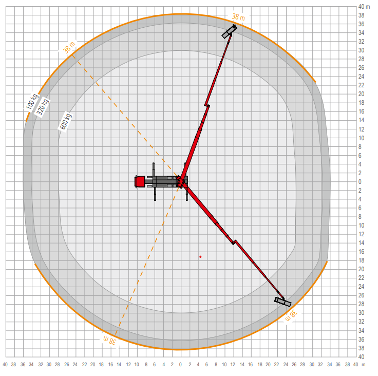 Met een maximale korfbelasting van 600 kg kunnen meerdere personen en materialen veilig worden meegenomen. Bij een gereduceerde korfbelasting van 100 kg wordt een maximale zijdelingse reikwijdte van 38 meter bereikt.